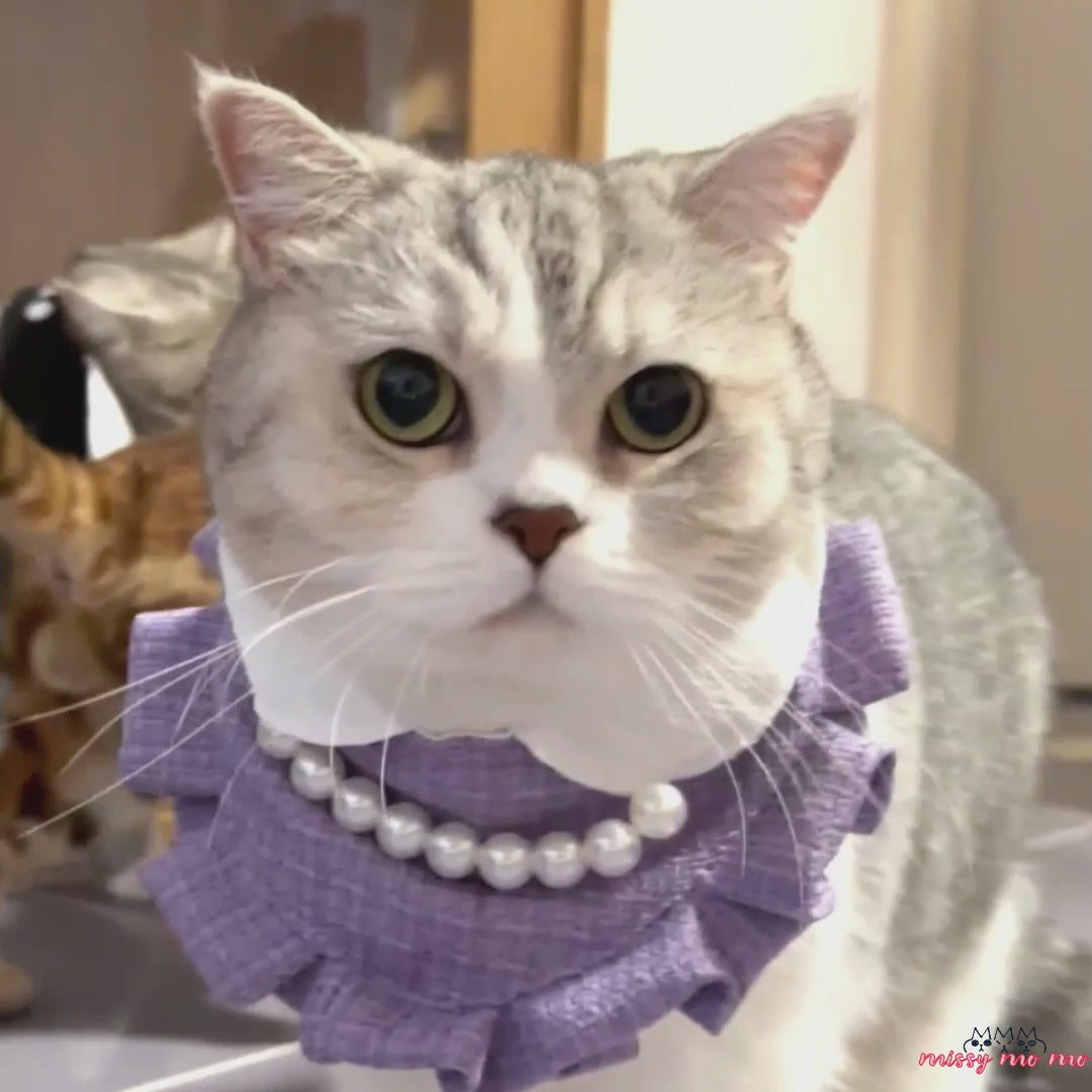 Spoil your cat with Parisian flair using this handmade cat bib featuring a pearl-like necklace. With an easy button closure, this ensemble turns your kitty into a cute little mademoiselle, capturing the chic vibe of Paris in every detail.